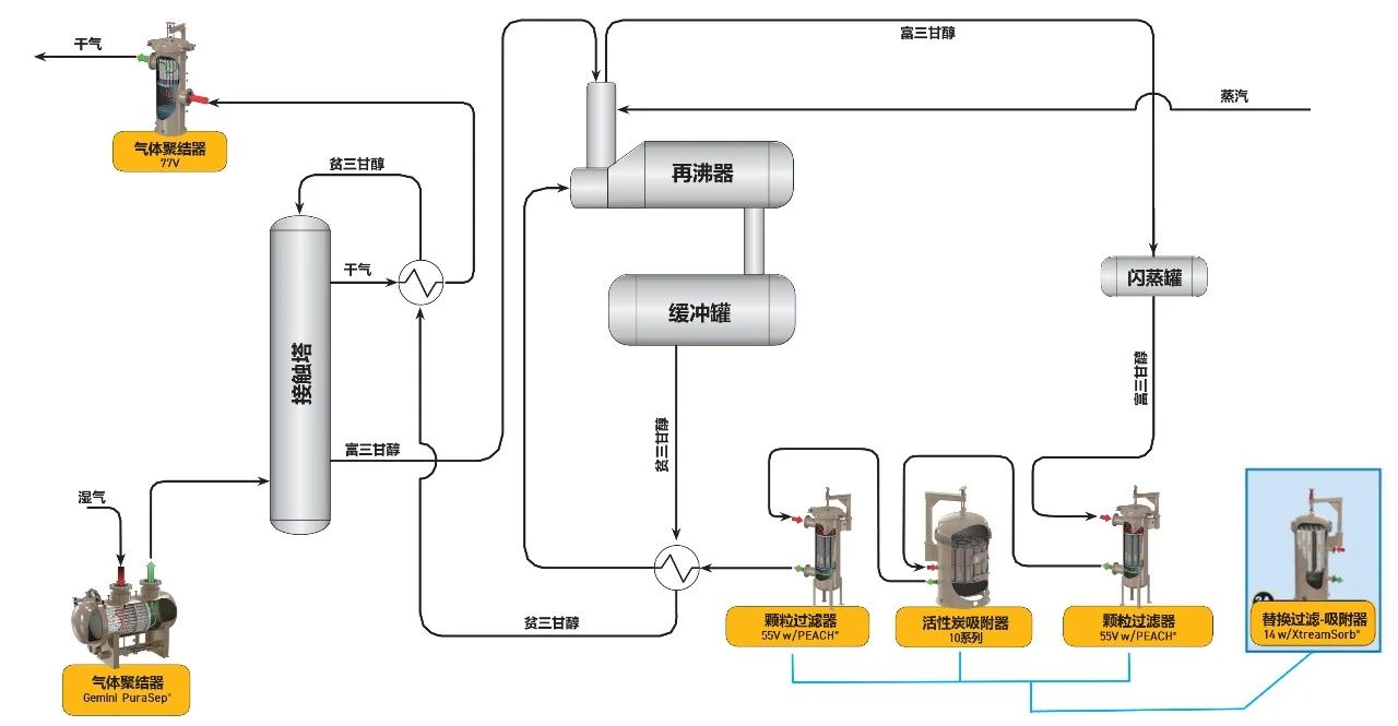 例如,天然气中的冷凝液、盐、颗粒等污染物可引起 TEG发泡,不仅导致气体不合规,含水量超标,露点升高,还会造成大量TEG夹带;TEG再生回路的过量油液会在塔内沉积,导致再沸器对TEG的实际用量读数不准;溶解在TEG液体中的盐会加速火管腐蚀,导致火管故障;悬浮颗粒物含量超出再生标准时,会导致托盘和泵堵塞、过滤器使用寿命缩短等问题……可以说,过滤将对整个脱水工艺的性能将产生直接影响。