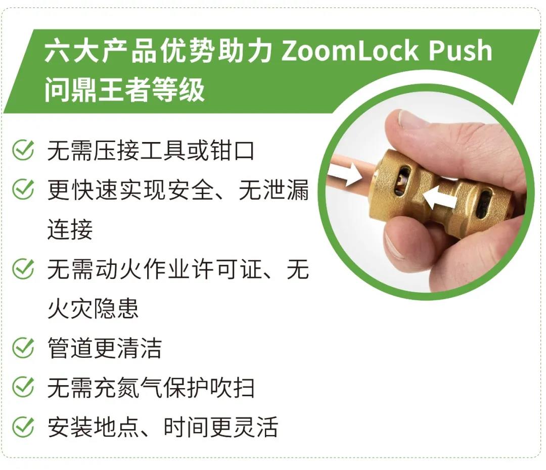 如果空调制冷管路连接技术也有段位的话,那么ZoomLock Push推入/按压式接头一定是王者等级!它不仅延续原ZoomLock产品的尊贵血统,坚守安全、清洁的无泄漏连接品质,更另辟蹊径,进一步加速管道安装。