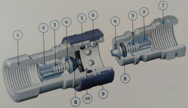 ①-插座本体 ②-护圈 ③-弹簧 ④-阀 ⑤密封 ⑥-O形圈 ⑦-套筒 ⑧-插头本体 ⑨-支撑圈 ⑩-弹性挡圈