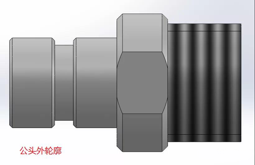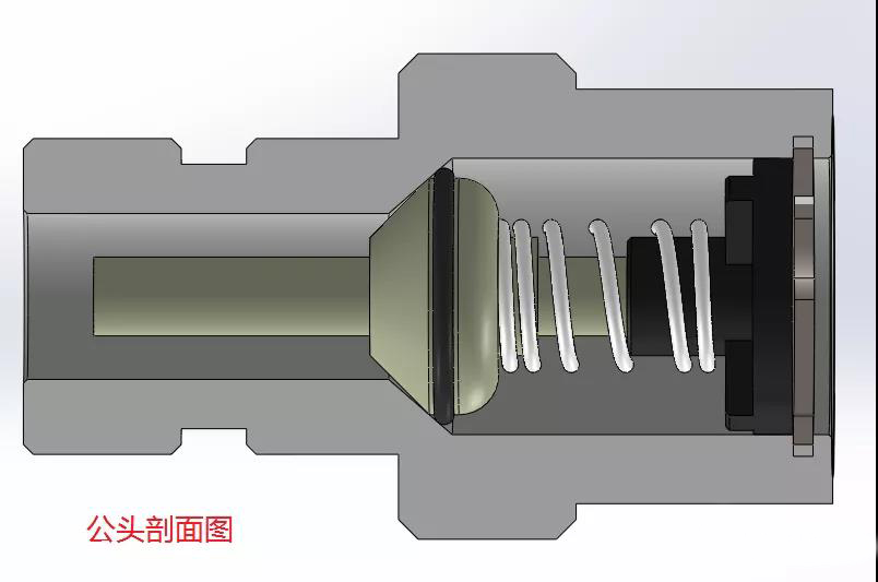 公头未与母头装配时阀芯在弹簧力的作用下保持封闭,管路不通。公头一般以螺纹连接的方式固定在阀板上,阀板中的螺纹孔需加密封圈保持密封。