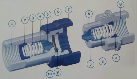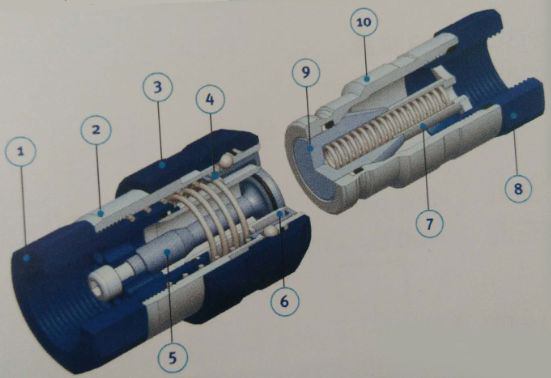 ①-插座本体 ②-护圈 ③-弹簧 ④-阀 ⑤密封 ⑥-O形圈 ⑦-套筒 ⑧-插头本体 ⑨-支撑圈 ⑩-弹性挡圈