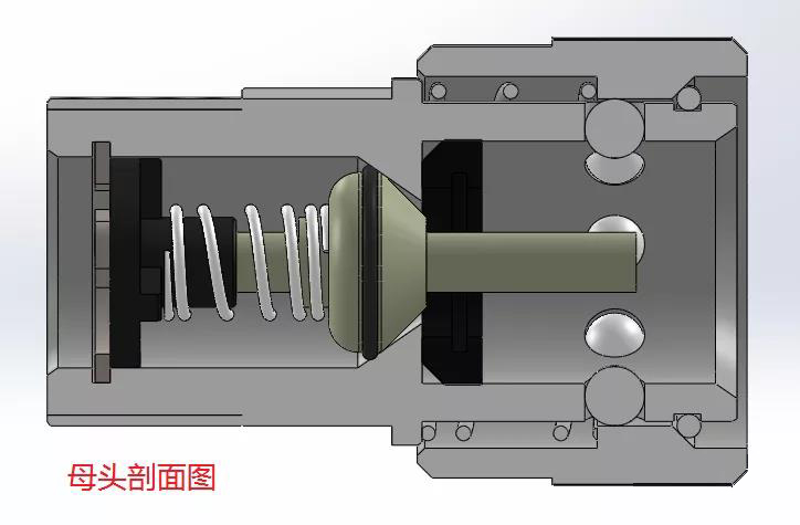公头未与母头装配时阀芯在弹簧力的作用下保持封闭,管路不通。公头一般以螺纹连接的方式固定在阀板上,阀板中的螺纹孔需加密封圈保持密封。